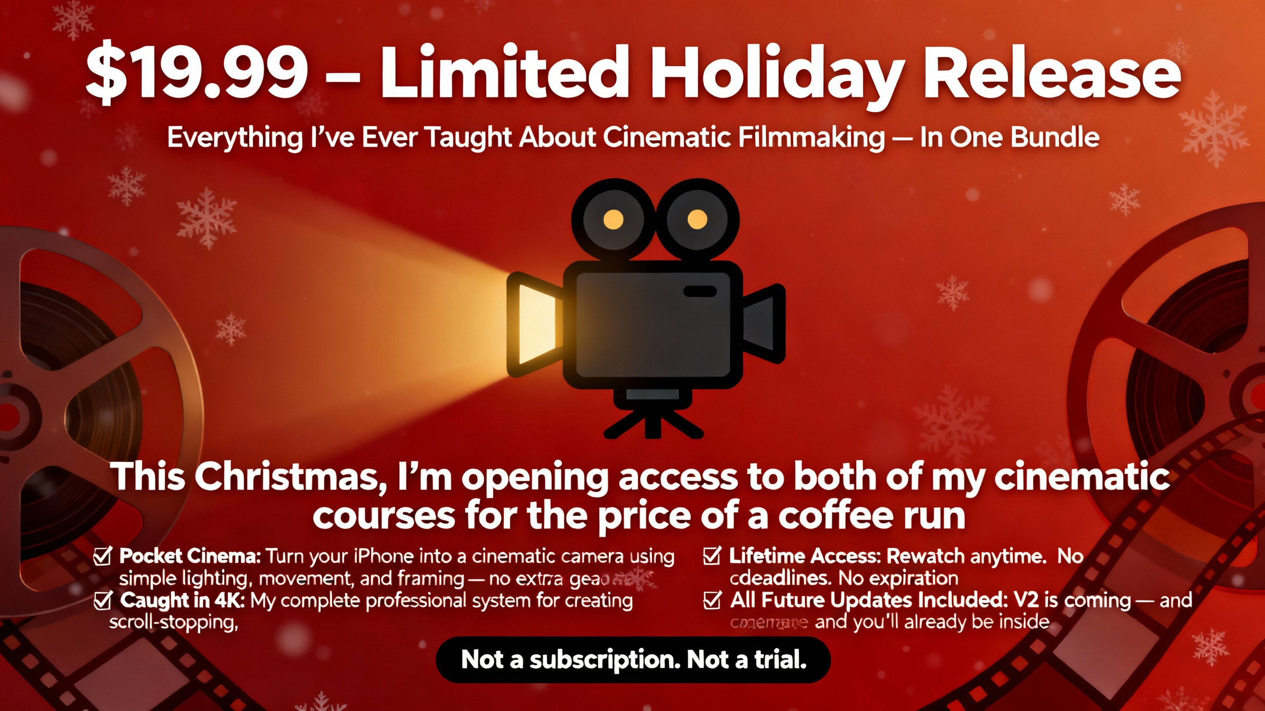 $19.99 — Limited Holiday Release Everything I’ve Ever Taught About Cinematic Filmmaking, In One Bundle. This Christmas, I’m opening access to both of my cinematic courses for the price of a coffee run. Not a subscription. Not a trial. Lifetime access. ⸻ What You Get (Holiday Edition) ✅ Pocket Cinema Turn your iPhone into a cinematic camera using simple lighting, movement, and framing — no extra gear needed. ✅ Caught in 4K My complete professional system for creating scroll-stopping, bran